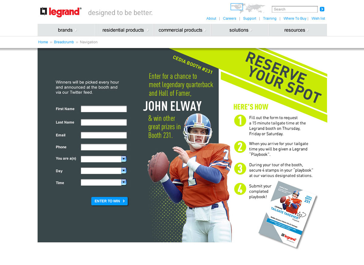 Objective: To create a look and theme for an upcoming exhbit show where John Elway will be attending our booth. This look crossed everything from the giveaway to the web landing page to the pull-up banners in the exhibit hall.